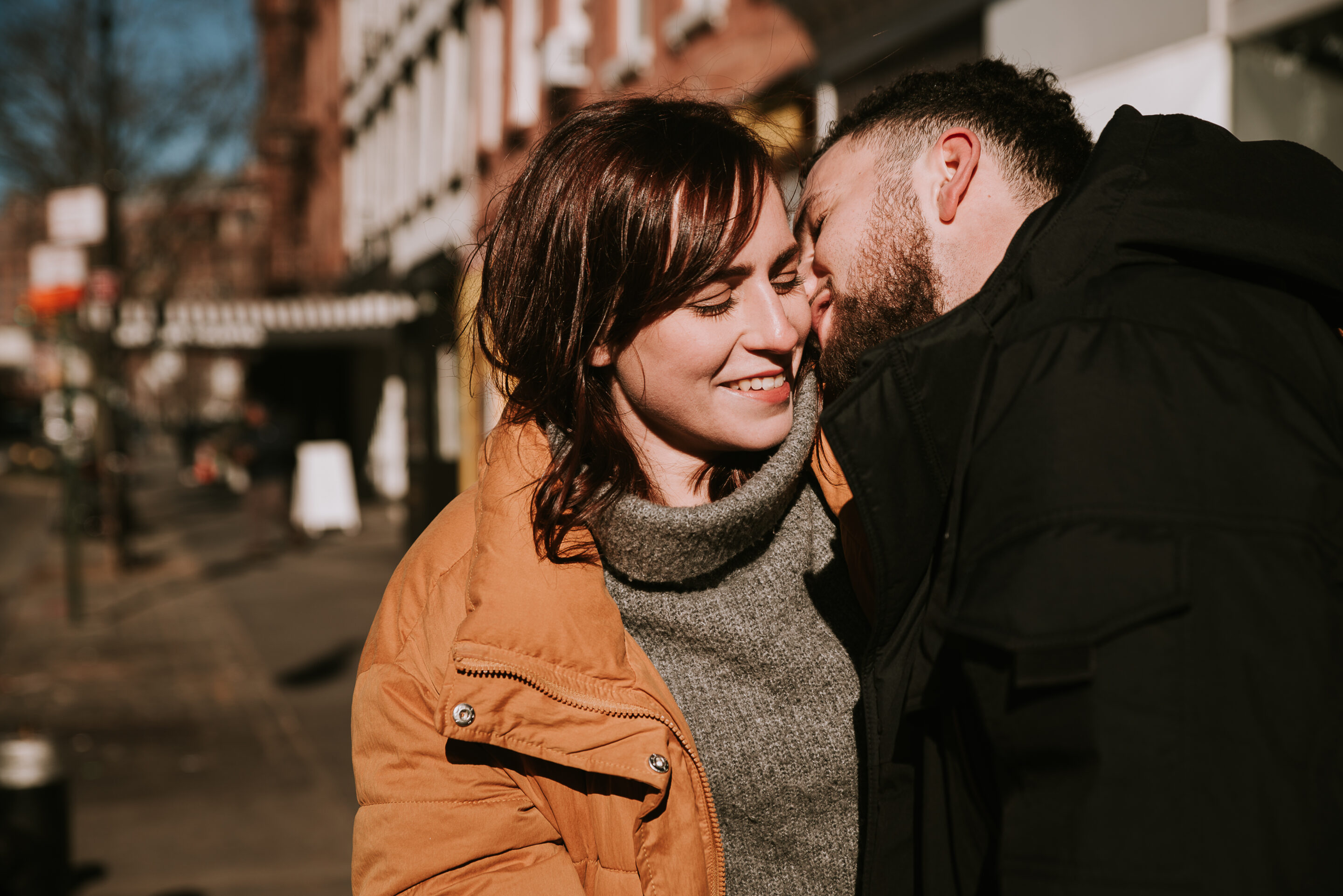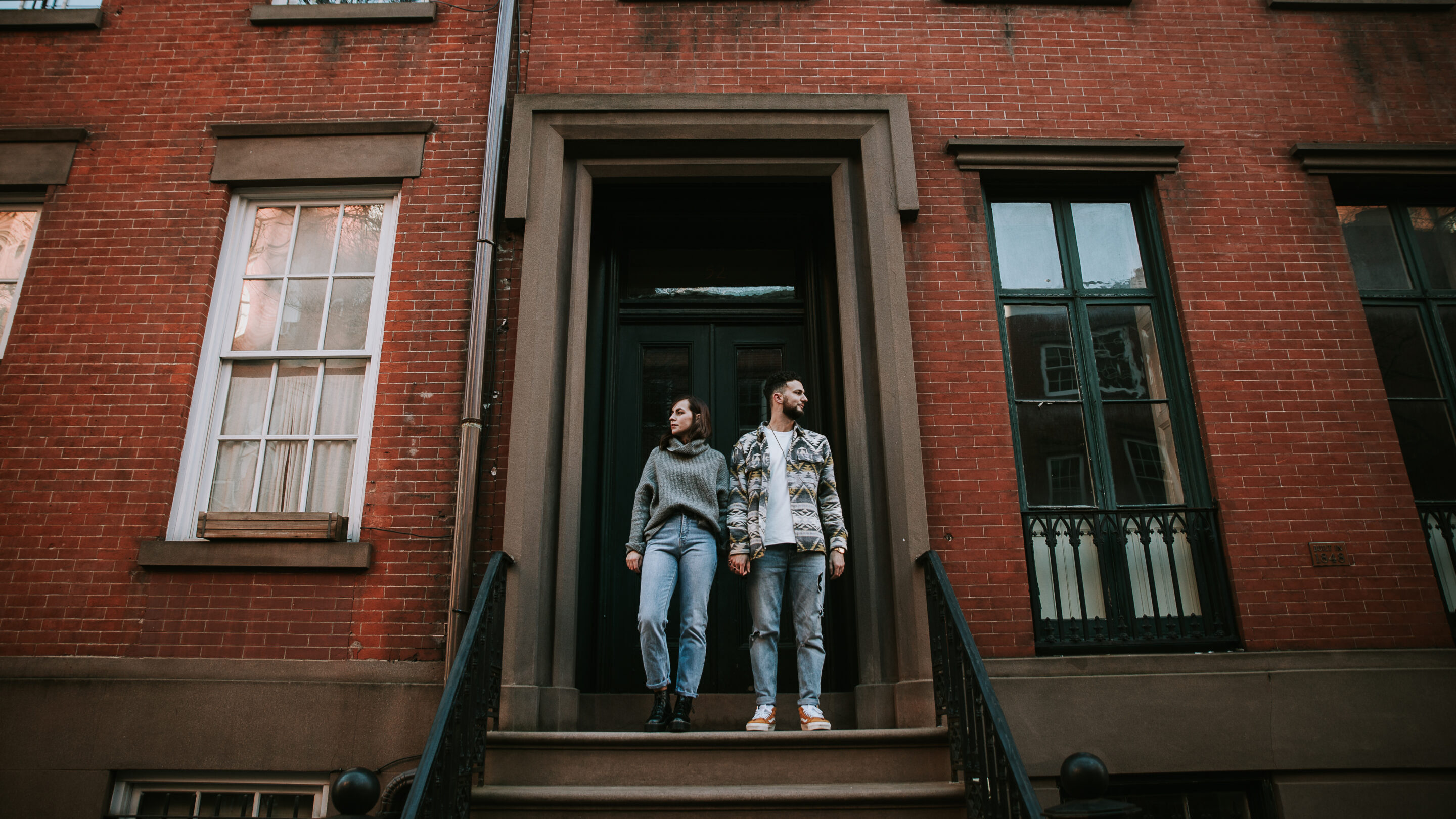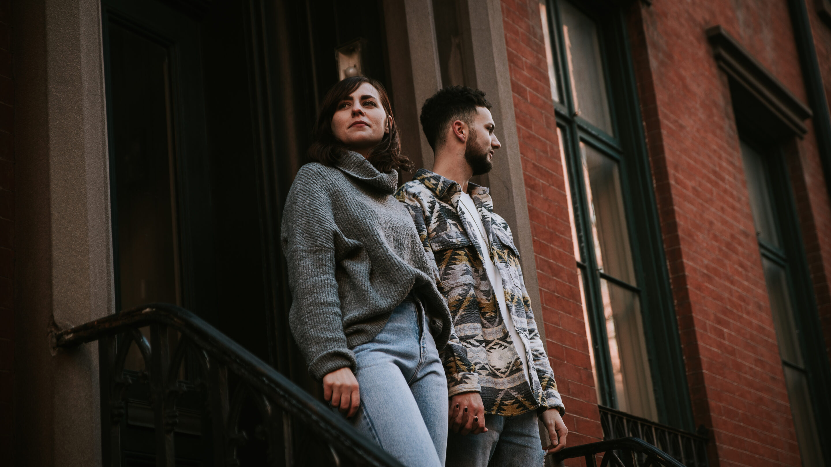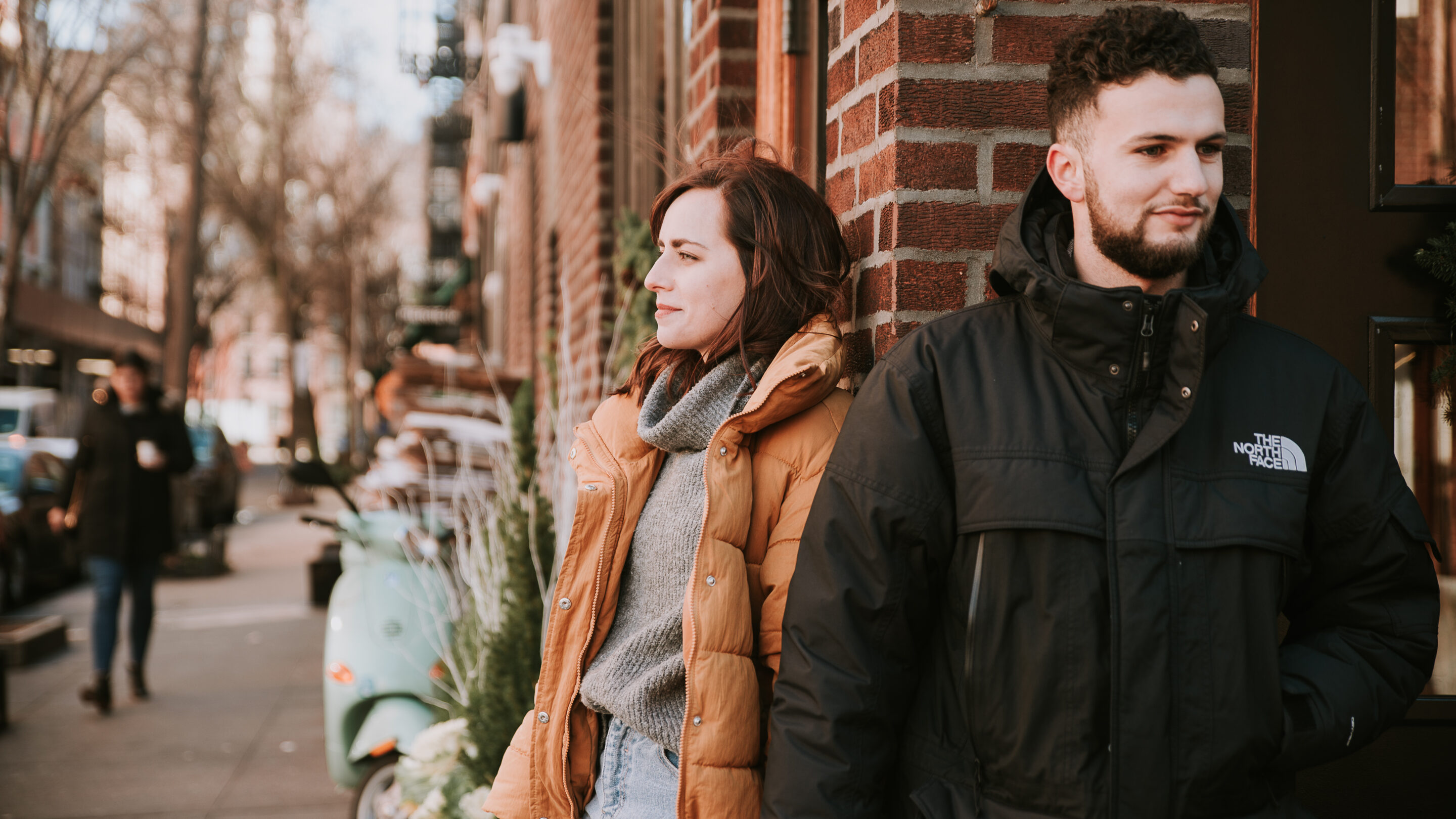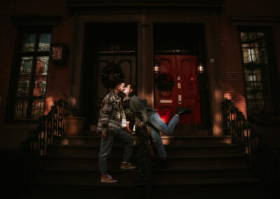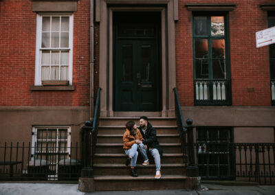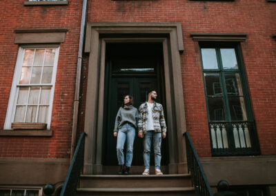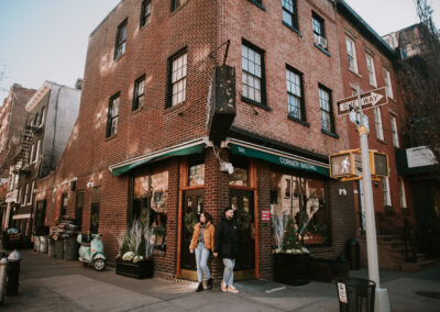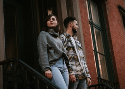 On trace sur les avenues animées. Solène attrape la main de Melvin devant un mur de briques iconique, sourire complice au milieu des passants. Les ombres des gratte-ciel rase le trottoir, la lumière urbaine sculpte leurs silhouettes sans chichi. Photographe de couple disponible à l’international, je colle au rythme : ici, New York impose sa puissance visuelle, et leur simplicité fait le reste.