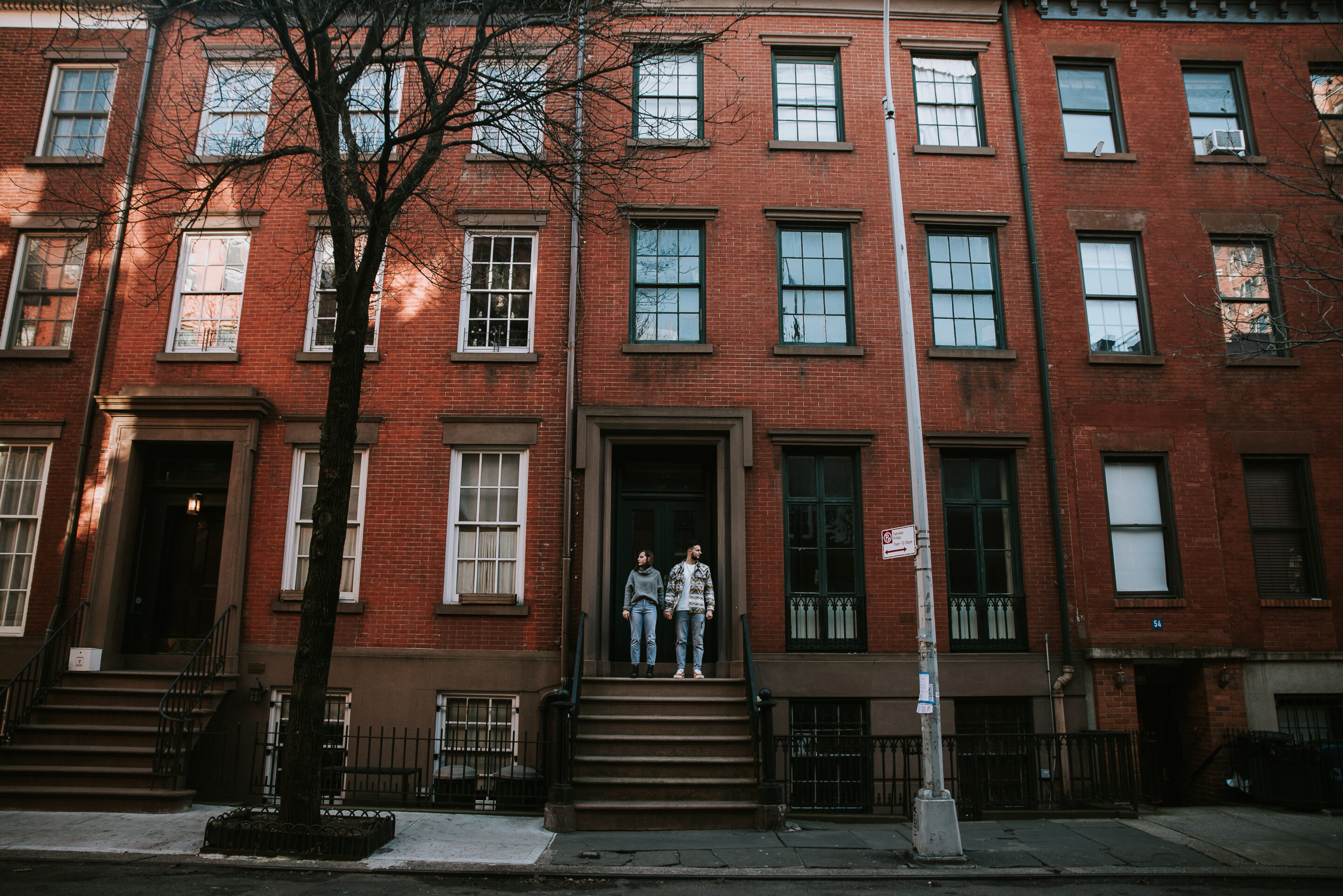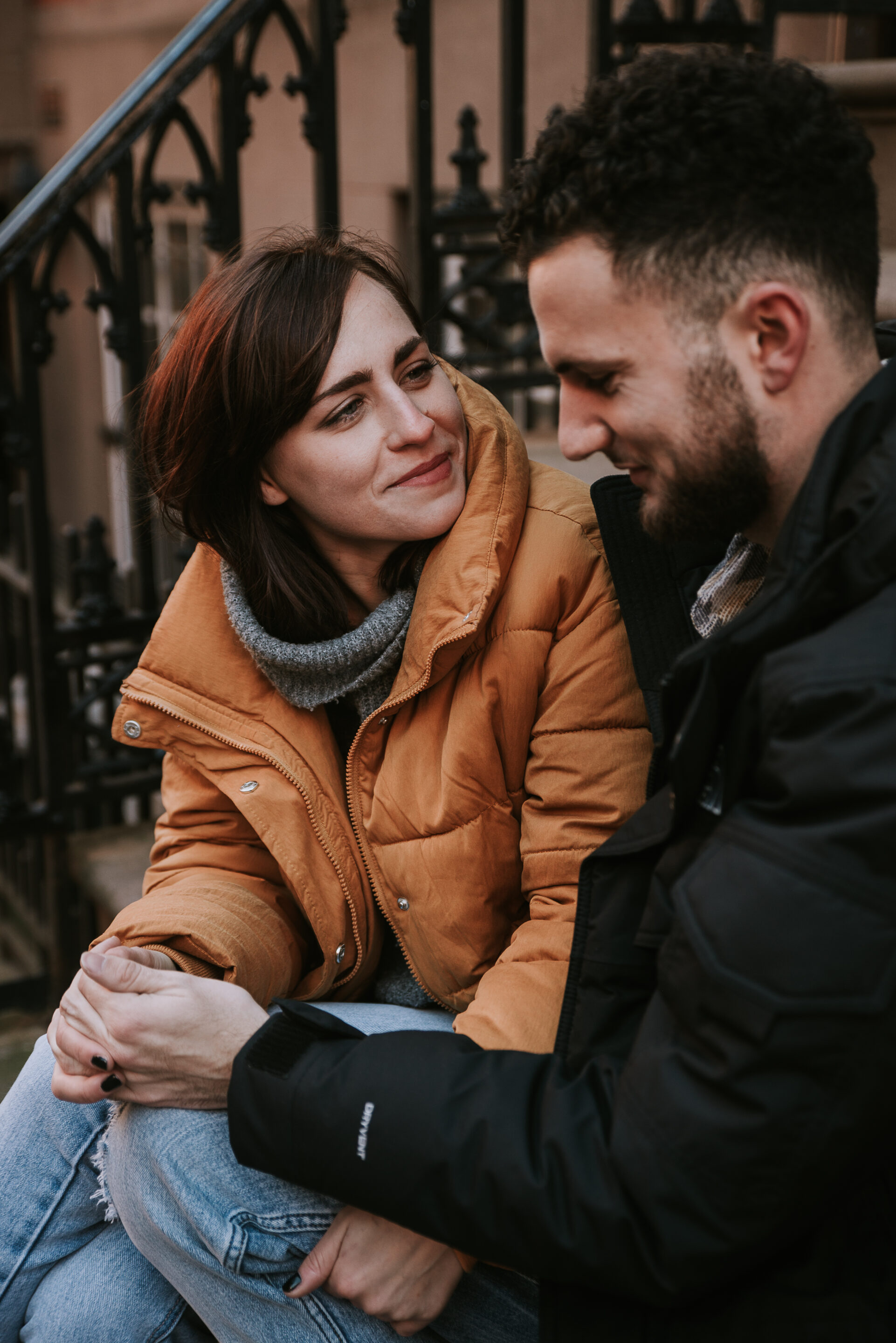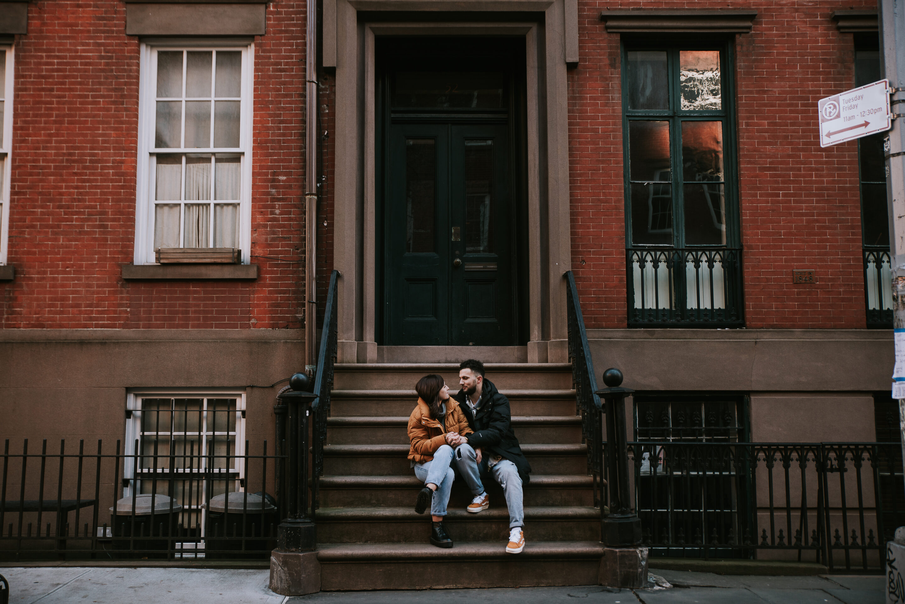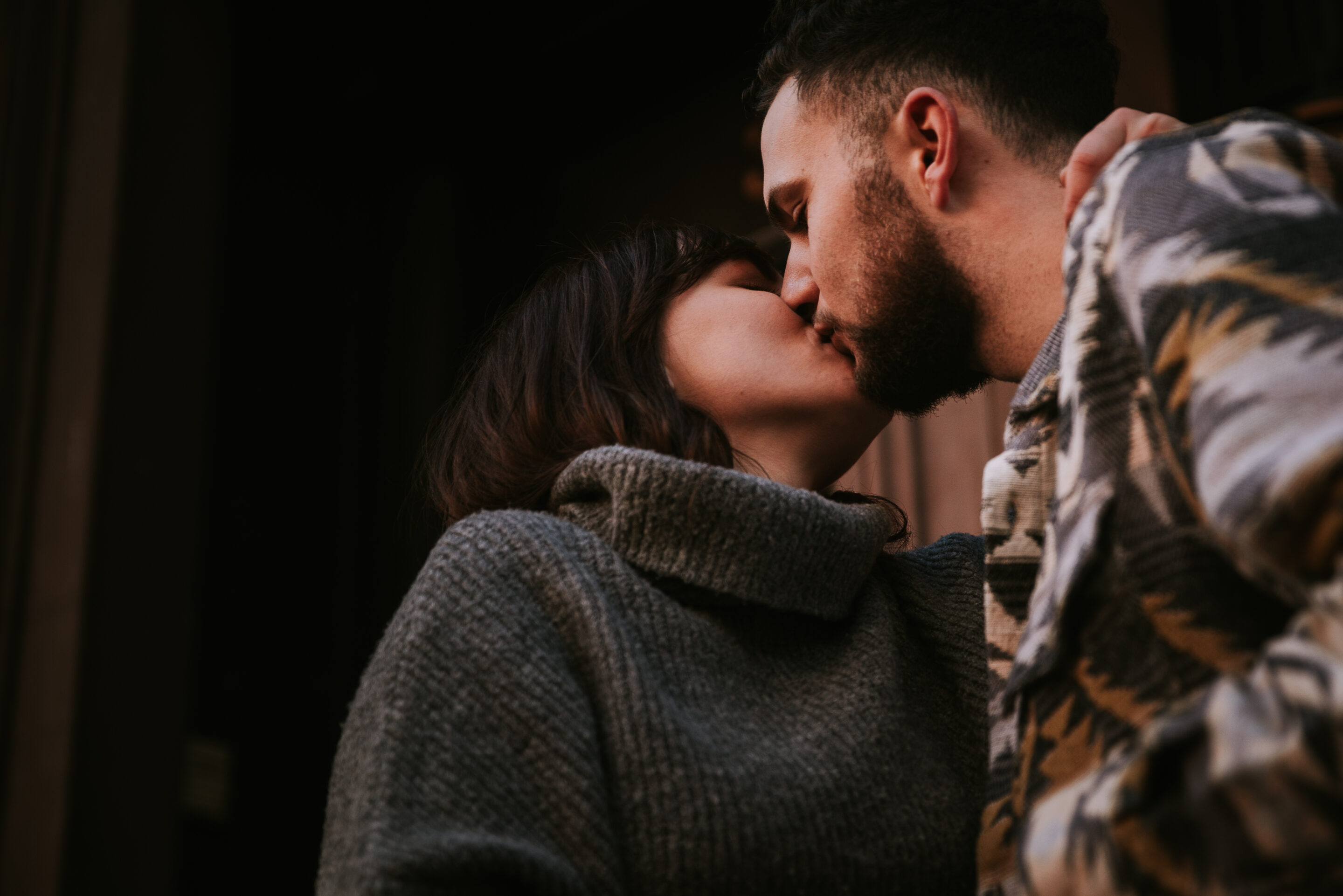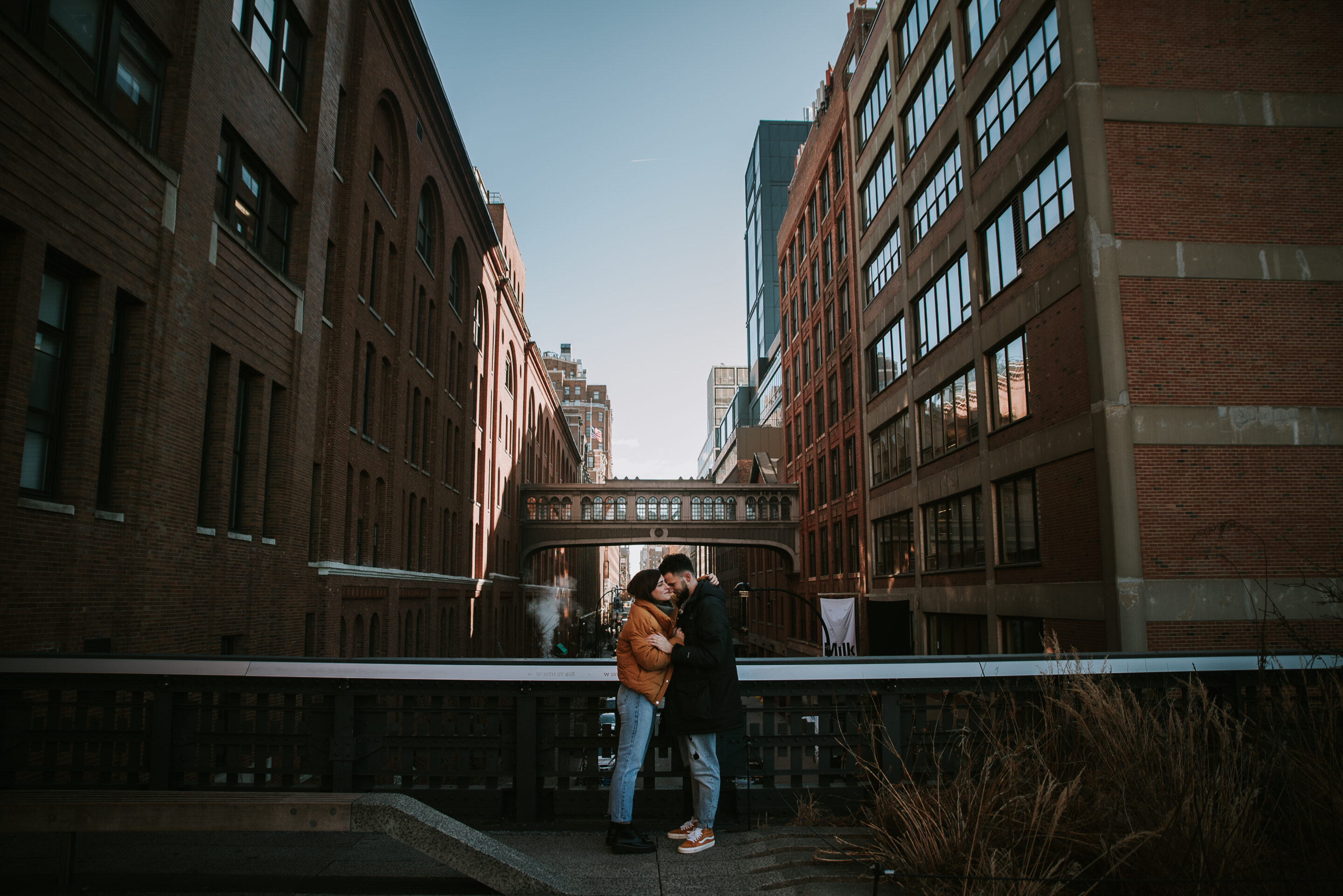 On trace sur les avenues animées. Solène attrape la main de Melvin devant un mur de briques iconique, sourire complice au milieu des passants. Les ombres des gratte-ciel rase le trottoir, la lumière urbaine sculpte leurs silhouettes sans chichi. Photographe de couple disponible à l’international, je colle au rythme : ici, New York impose sa puissance visuelle, et leur simplicité fait le reste.